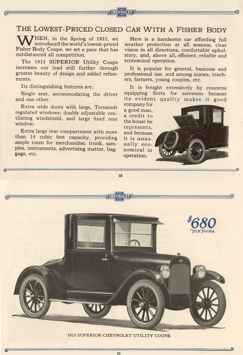 Chevrolet’s sales literature for its 1923 model emphasizes the car’s “beauty of design” and