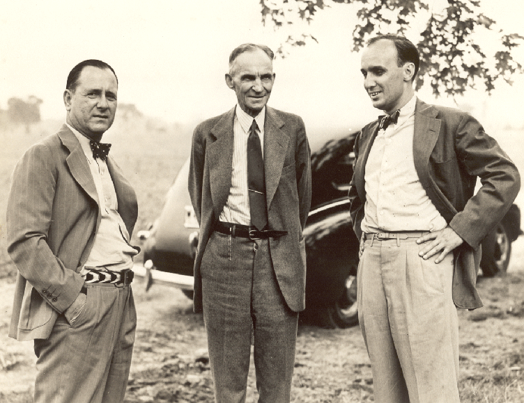 Harry Bennett (1892-1979) was head of Ford’s Service Department, or internal security. He ruled the Rouge Plant, and some say Henry Ford himself, through threats and intimidation, arguably becoming more influential than Edsel Ford, Henry’s son and the company’s President from 1919 to 1943. He first worked in Ford’s art department in 1917, but his “tough guy” manner got him appointed head watchman, and eventually he supervised over 3000 reputed crooks and retired policemen in the Service Department. “The Battle of the Overpass,” Ford’s 1937 response to attempts at unionization, was led by Bennett. Ford fought unionization until 1941. While rumor had it that Ford wanted Bennett to replace him as president, that job went to Henry Ford II, who fired Bennett in 1945. Harry Bennett (left) with Henry Ford (center) and John Corlisle (right) at Camp Legion in Dearborn, MI, June 19, 1939. |