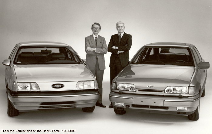 The Ford Taurus (and its essentially similar cousin, the Mercury Sable) is probably one of the two most significant American automobiles of the 1980s (the other is the Chrysler minivan). The exterior styling incorporated a number of emerging trends. The 1986 Taurus set the pace for the aerodynamic look of today. Below are the Ford Taurus (left) and Ford's European Scorpio. Pictured between the automobiles are Louis R. Ross (left), Ford executive vice president of North American Operations and Robert A. Lutz, chairman of the board of Ford of Europe. Here they are celebrating the twin win in 1986, a first in Ford's history, when the Taurus was named "Car of the Year" by Motor Trend magazine in the United States and the Scorpio was named "European Car of the Year 1986" by an international jury of 56 motoring journalists representing media in 17 European countries. Read more about the 1986 Ford Taurus on The Henry Ford website. |