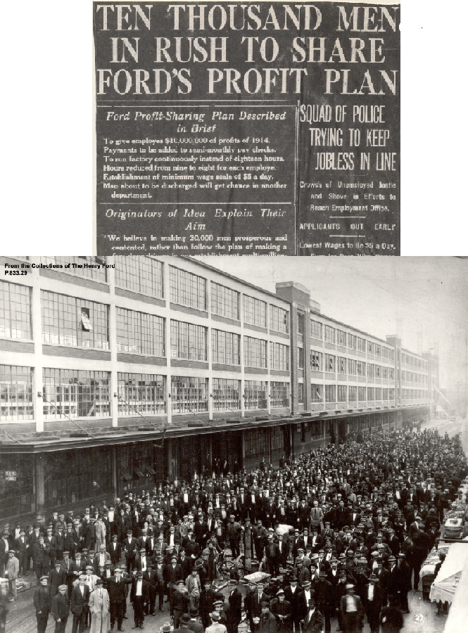 The announcement on January 5, 1914, of Ford’s $5 day sent hordes of job-seekers to the company’s factory in Highland Park. Below you can see an example of the amount of potential employees that were brought out by this announcement in 1914. Click here to read the full article: "Ten Thousand Men in Rush to Share Ford's Profit Plan." The picture below shows an example of the number of potential employees brought out by Ford’s announcement. |