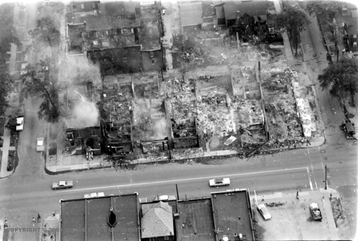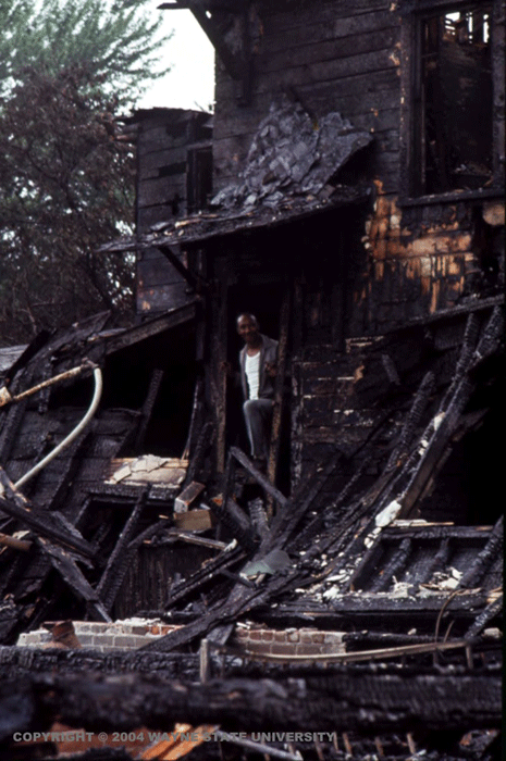 Black Power is a term coined in 1966 by Stokely Carmichael to encourage the uniting of Black Americans behind the ideas of racial solidarity and political action in their fight for equality. The Black Power movement resulted in the founding of numerous organizations, such as the Black Panther Party, which developed into the militant wing of the Civil Rights movement. They were instrumental in the uprisings in the cities of Detroit, Newark, and Los Angeles during the late 1960s. Fires burning on July 24, 1967, during the uprising of African Americans in Detroit (top); National Guardsmen in an armored vehicle on the streets of Detroit during the uprising (middle); an African American man standing in the doorway of a burned building in Detroit on July 27, 1967 (bottom).